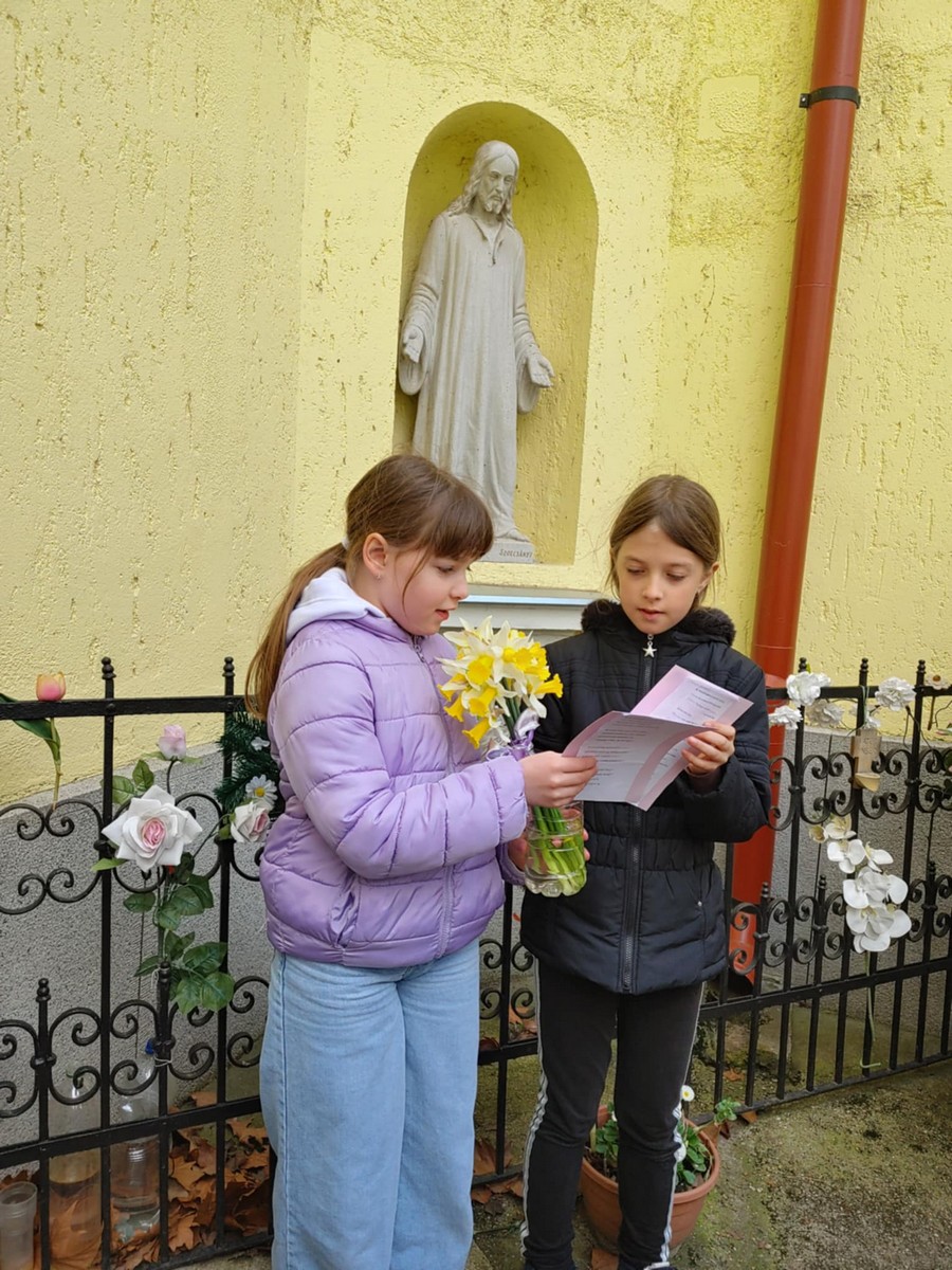 „Aki énekel, kétszeresen imádkozik”- tartja Szent Ágoston. Jóhangú másodikosainkkal együtt énekelt iskolánk kis énekkara is, segítve a keresztút jelenvalóságát megélnünk, mint ahogyan a szentmisében is megjelenik Krisztus áldozata.