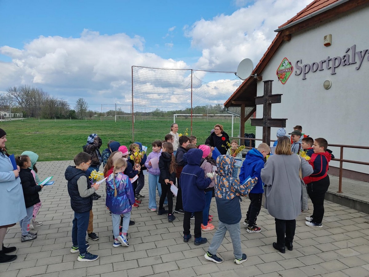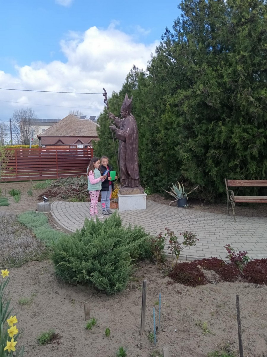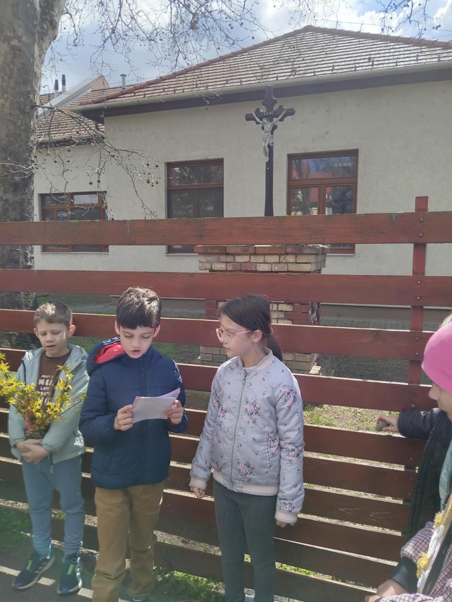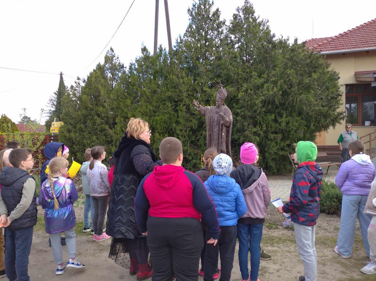 A Gondozási Központ udvarán kedves vendéglátásban volt részünk, énekkel viszonoztuk. Szent II. János Pál pápa szobrának Szatymazra érkezéséről hallottunk, arról is, iskolánk sakkban ügyes diákjai rendszeresen részt vesznek a Wojtyla Kupán. A Dankó Pista Művelődési Házban pászkát és vizet vettünk magunkhoz, visszaemlékezve Mózesre, aki kivezette a zsidóságot Egyiptomból, az első húsvét alkalmával.
